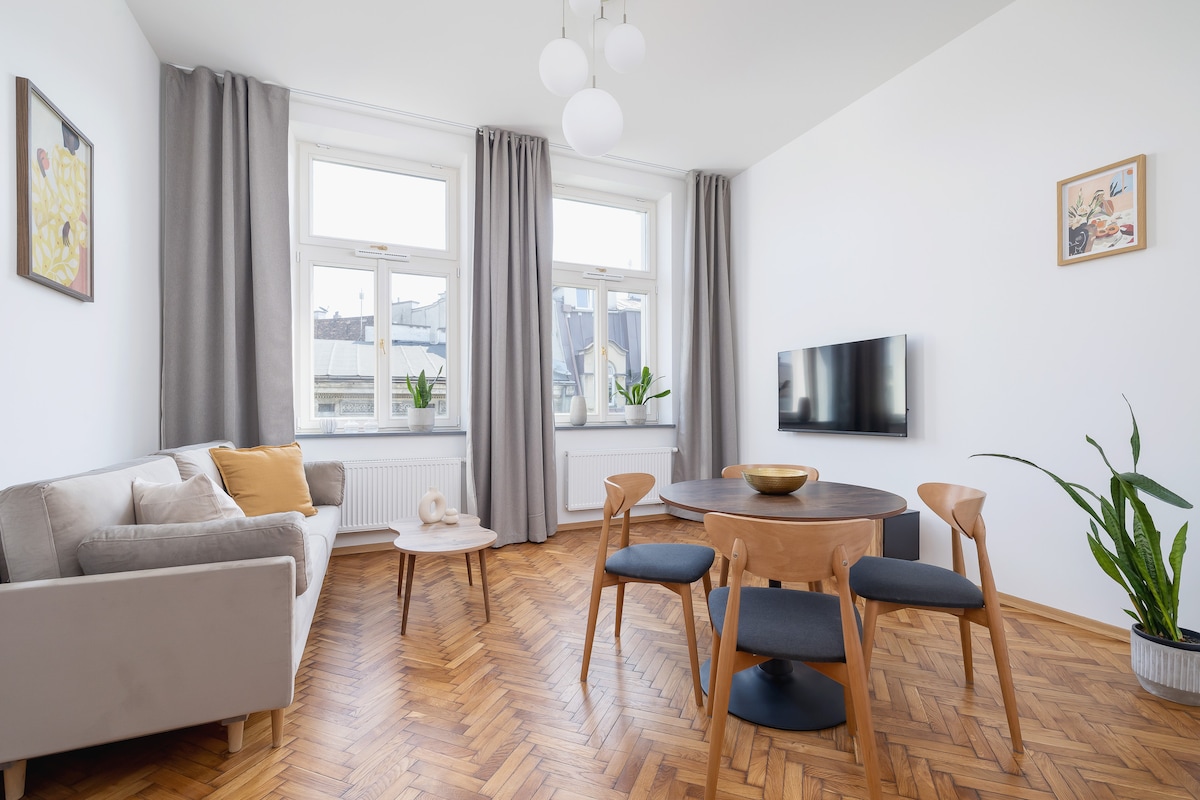 Thư giãn trên ghế sofa cabriole cổ trong khu vực sinh hoạt đầy ánh sáng được trang trí bằng thảm da cừu và đồ nội thất cổ. Các điểm nhấn được tái chế và những điểm nhấn tối giản trong suốt mang lại bầu không khí chiết trung cho không gian được tu sửa này. Căn hộ nằm trong một ngôi nhà chung cư thế kỷ 19, trong Khu phố cổ giữa Quảng trường chính và khu phố Do Thái cũ. Tản bộ qua những con phố đặc biệt với các cửa hàng đồ cổ kỳ lạ, phòng trưng bày nghệ thuật hấp dẫn và quán cà phê sang trọng tồi tàn.