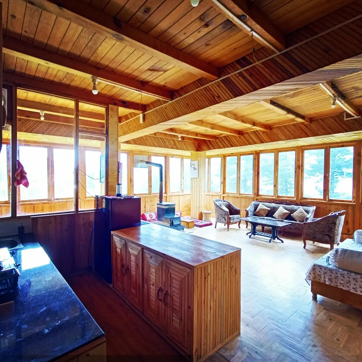 Rooms are furnished with double bed adjacent to the snow capped mountainside window and attached washroom with respective rooms. Drawing room is your workstation and ample space is provided with work from home setup. Along with these amenities, We take care of not so regular dining table. The traditional dinning tables have been arranged for nice supper. We provide you with fully functional kitchen having gas stove and utensils.