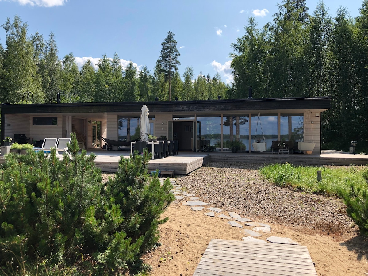 Một biệt thự nhỏ sang trọng được xây dựng vào năm 2022 trên bờ biển Vuohijärvi trong vắt, gần Vườn quốc gia Repovesi. Tất cả các phòng đều có cửa sổ toàn cảnh lớn và tầm nhìn tuyệt đẹp ra thiên nhiên và hồ. Nhà nghỉ thôn dã được trang bị cho hương vị đòi hỏi khắt khe nhất với tất cả tiện nghi, đồ nội thất thiết kế Bắc Âu và nghệ thuật đương đại. Từ một phòng xông hơi đốt củi, chỉ cách một bãi biển cát dày đặc nhẹ nhàng và một bến tàu lớn để ngâm mình trong hồ và mở cửa vào mùa đông!