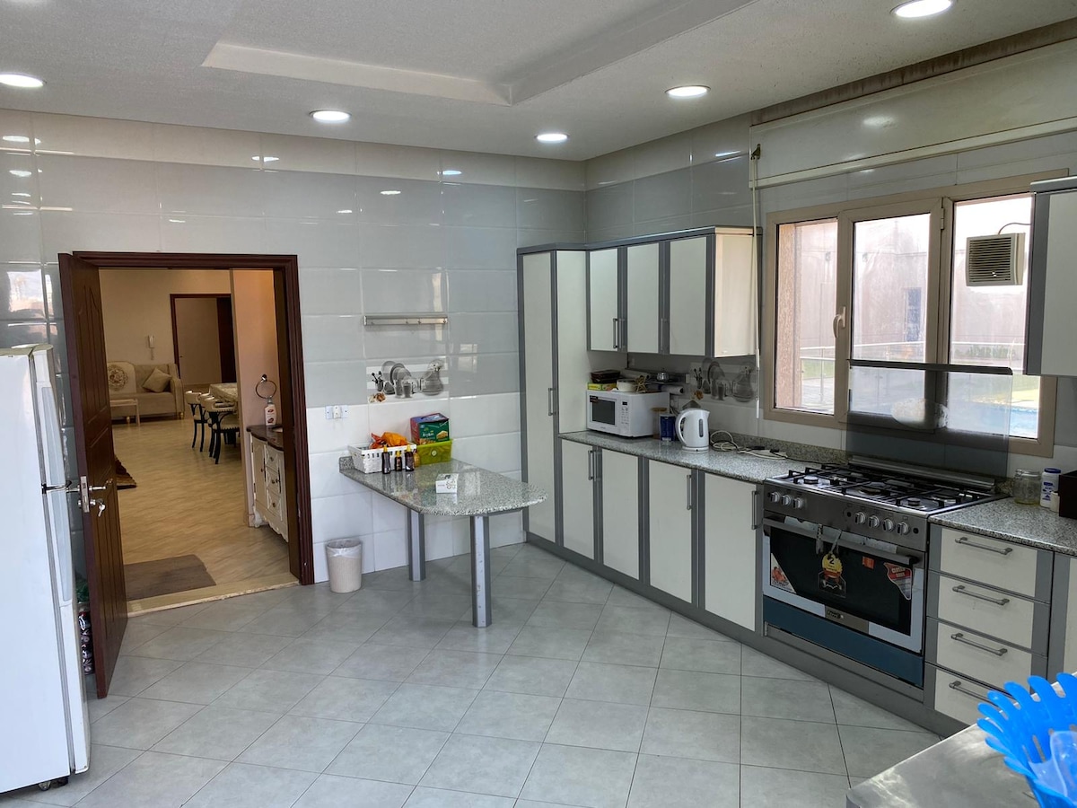 A place for romantic get away or family gathering. its live and relaxing with manny plants, animals, swimming pool, and playground.. the building : 2 master room (with bathroom) 1 kids room (4 beds) 1 living room (with bathrooms) 1 dewaniya (large room with bathroom) 1 made (helper "khadama") with bathroom 1 modern kitchen the farm 30 minutes drive from the avenues mall in kuwait.25 minutes drive from Jaber Al-Ahmad International Stadium.