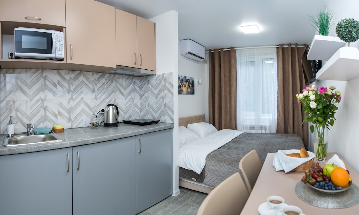 Căn hộ một phòng theo phong cách tối giản. Diện tích căn hộ là 15 mét vuông. Có nước nóng liên tục từ nồi hơi 80 lít. Căn hộ nằm ở tầng ba không có thang máy. Có WiFi tốt và TV với truy cập internet. Căn hộ không có bếp. Chỉ có lò vi sóng và ấm đun nước, cũng như mọi thứ bạn cần để làm salad.