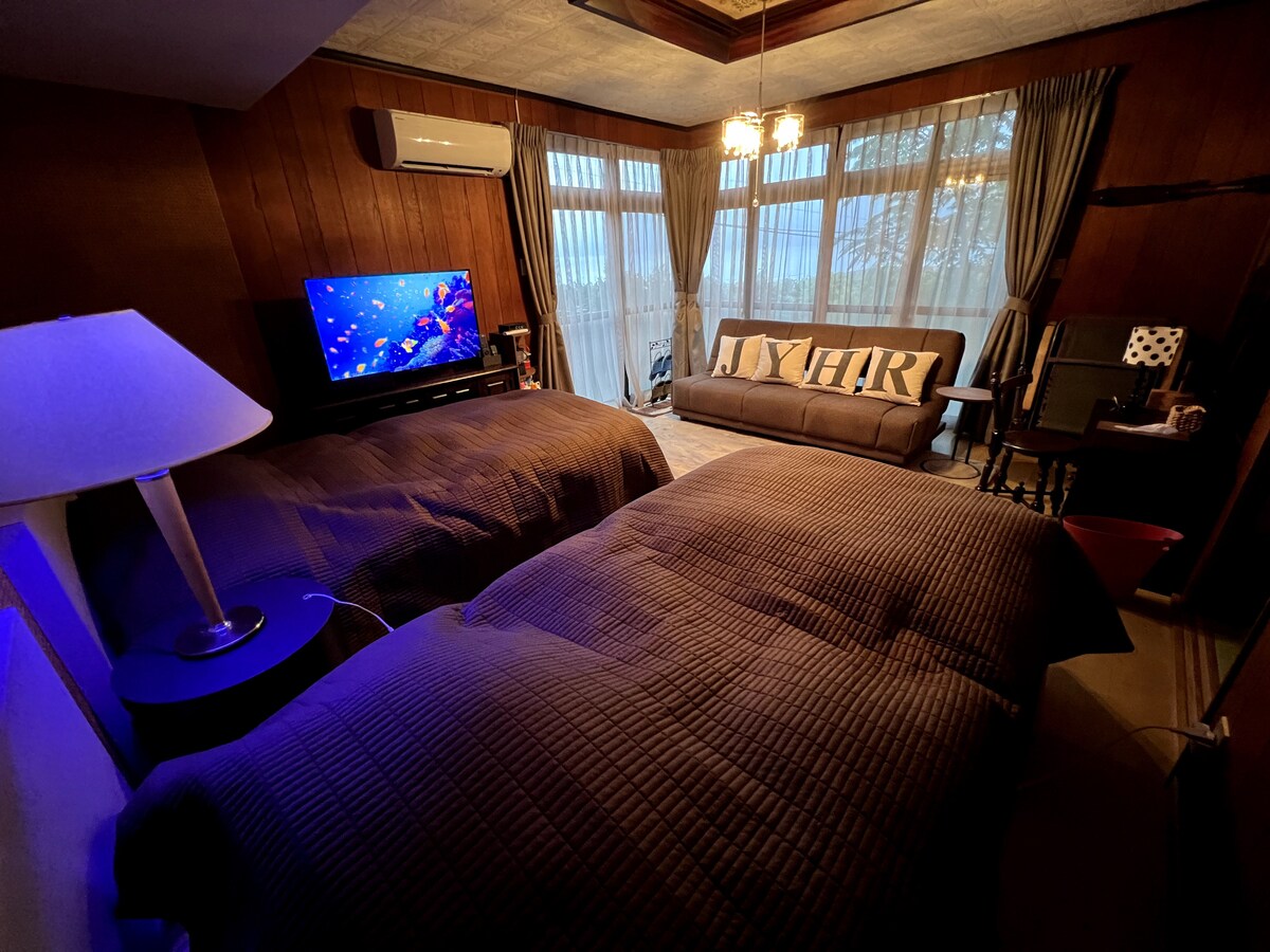 This is a two-story home built in the 1980s, with a small backyard attached. It is about 150 meters from the beach. The first floor has a Japanese-style bedroom, dining room, bathroom and toilet of about 100 square meters. The tatami bedroom is suitable for 4 guests to rest. On the second floor, there is a Japanese-style bedroom for 2 guests. one toilet. and a bedroom with 2 single beds. There is a 24-hour convenience store, grocery store, izakaya, restaurant within a 10-minute walk.