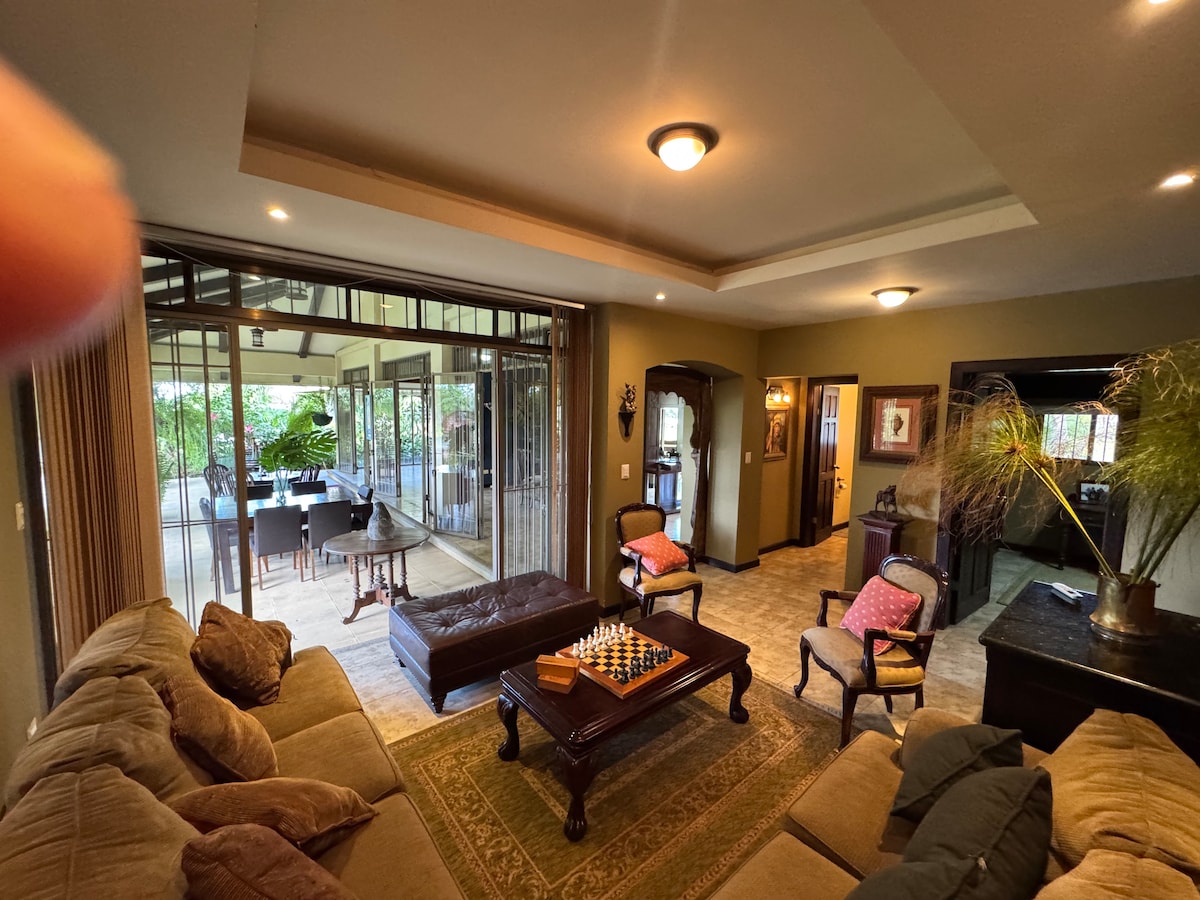 Nhà của chúng tôi nằm ở Alajuela, trong một khu phố yên tĩnh chỉ cách Sân bay quốc tế Juan Santamaría vài phút và gần các điểm tham quan địa phương. Chúng tôi cung cấp 5 phòng (3 phòng có phòng tắm riêng, một trong số đó có giường đơn). Nhà có một gara cho 2 xe ô tô thông thường và có thêm 2 phòng tắm đầy đủ. Tận hưởng bếp đầy đủ tiện nghi hoặc thư giãn trên võng và tận hưởng các khu vườn, thường có chim ruồi và bướm ghé thăm. Nhận phòng: 10 giờ sáng – 10 giờ tối (thêm 50 USD cho nhận phòng ngoài giờ) Chiều cao đỗ xe: 2m/6,5ft