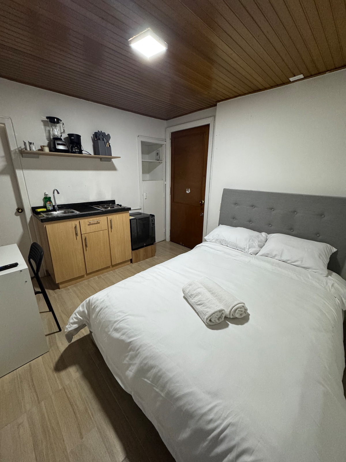 Acogedor apartamento, el cual cuenta con cama doble, televisor, escritorio, sofá, armario, baño privado y cocina con todos los implementos y electrodomesticos necesarios para uso del huésped, todo nuevo. El conjunto esta ubicado en una zona muy central, cerca del centro historico e internacional, donde se encuentran los mayores atractivos de Bogotá. Con vias de facil acceso y sistemas de trasporte publico que conectan el centro con el aeropuerto y la terminal de transporte.