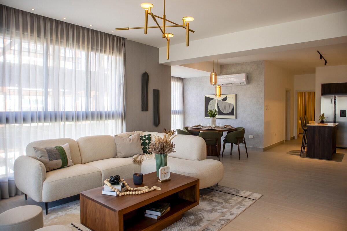 Apartamento exclusivo de una habitación en prestigiosa torre de Santiago, con diseño natural en maderas y tonos verdes que crean un ambiente sereno y elegante. Cocina moderna, amplia habitación y acceso a piscina Infinity en la azotea con vistas a la ciudad. Ubicación céntrica, ideal para parejas y viajeros (obra ext).