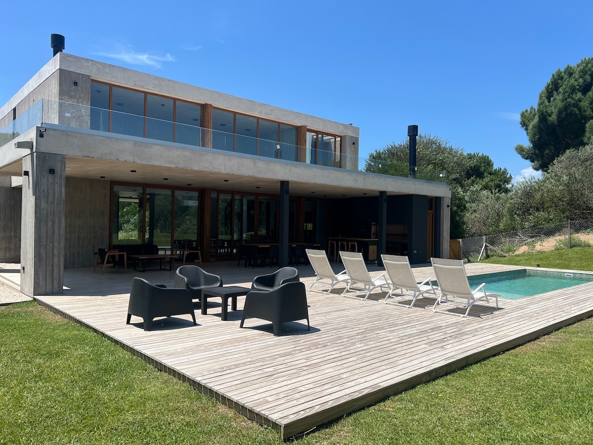 Cabin đẹp trong barrio Bosques en Costa Esmeralda. Hoàn hảo cho các gia đình. Cửa sổ lớn, lò sưởi bằng gỗ, boong, vỉ nướng, hồ bơi và lò sưởi dưới những vì sao. Chỗ ở có TV có kết nối cho các thiết bị, WiFi, không khí lạnh/nóng trong mọi môi trường, quần áo trắng và nhà bếp được trang bị. Gần nguồn cung cấp và 5 phút lái xe ra bãi biển. Costa Esmeralda có nhân viên an ninh 24/24. Khu thể thao và điểm dừng chân trên bãi biển. Lý tưởng để thư giãn, kết nối lại và tận hưởng.