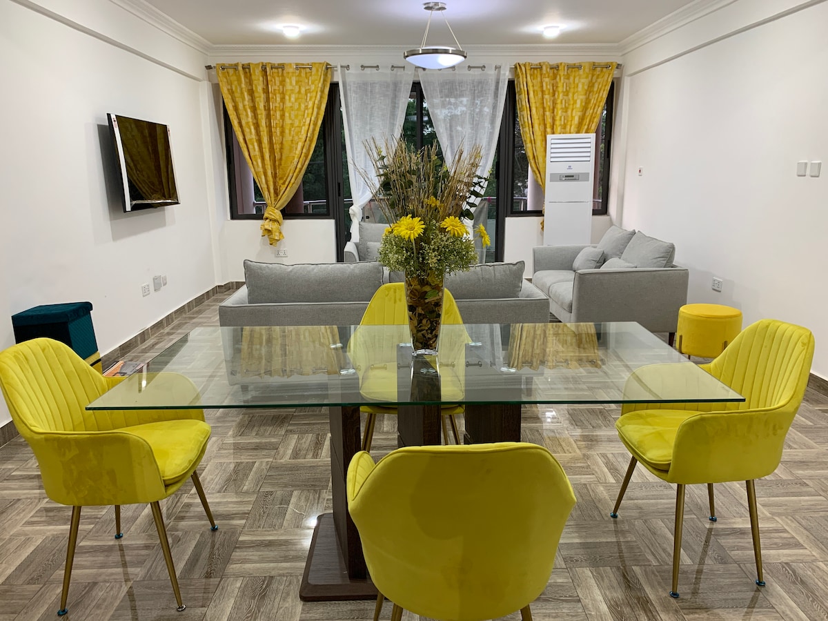 A spacious, fully furnished, modern apartment in the prime area of Cantonments, Accra. Two ensuite bedrooms, one guest toilet, living room, dining area, a fully equipped kitchen with cookware and laundry facilities, WiFi, A/C, DStv, large windows,plenty of natural sunlight. 24hr security, backup generator & water supply, free parking, pool& gym. The accommodation is strictly non-smoking. 10min from the Kotoka International Airport. Centrally located for all popular entertainment venues in Accra.