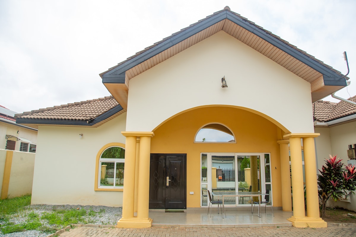 Tận hưởng trải nghiệm phong phú trong ngôi nhà sang trọng tại Sân bay East này, hoàn hảo cho gia đình và nhóm của bạn. Nhà được trang bị đầy đủ điều hòa, nhà bếp hoạt động tốt, giường siêu thoải mái, ghế sofa ấm cúng,an ninh, internet không giới hạn,DSTV, hệ thống giải trí và Máy phát điện dự phòng 66kva cho sự thoải mái vô tận của bạn. Vị trí cách sân bay 10 phút lái xe và trong bán kính 15 phút từ tất cả các địa điểm giải trí và kinh doanh chính trong thành phố bao gồm Bãi biển Labadi,East Legon, Accra Mall, nhà hàng nổi tiếng và cuộc sống về đêm. Hãy nồng nhiệt chào đón