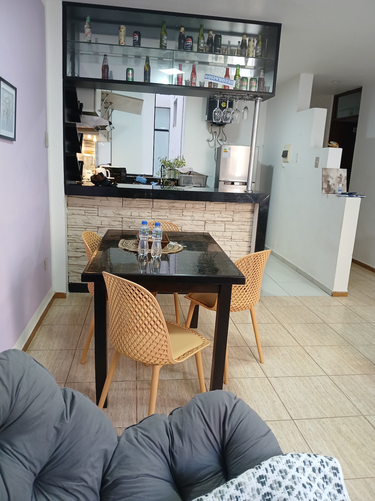 Moderno, tranquilo, ubicado en pleno centro de Trujillo, muy ventilado con luz natural porque todos los ambientes tienen ventanas al exterior, ideal para familias hasta seis personas, porque cuenta con sala, comedor (6), cocina equipada, 1 dormitorio matrimonial con baño privado, y dos dormitorios con camas diván y colchones ROSEN, con baño completo, con mesa de trabajo para laptop, tres televisores, agua caliente, área recreativa para niños, estacionamiento privado con seguridad las 24 horas.