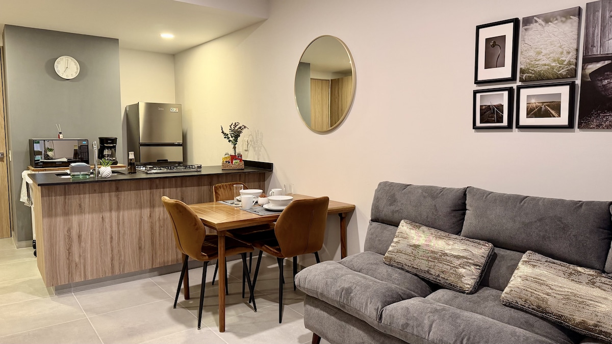 - Studio điều hành ấm cúng và độc quyền với giường cỡ queen, bàn làm việc và điều hòa không khí. - Ban công để có không khí trong lành - Một nhà bếp được trang bị đầy đủ tiện nghi. - Lối vào có khóa thông minh và chìa khóa tùy chỉnh và độc quyền cho mỗi khách. - Toàn cảnh tầng thượng với nhà hàng trên tầng 9 - Phòng họp được trang bị cho các cuộc họp chuyên nghiệp (kiểm tra tình trạng còn phòng) - Ra vào 24/7 với mã tùy chỉnh. QUAN TRỌNG: Chúng tôi không có chỗ đỗ xe riêng bên trong chỗ ở.