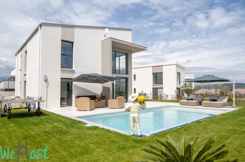 Biệt thự sang trọng đẹp với tầng 130 m2 , lý tưởng cho 8 người Không gian sinh hoạt rộng hơn 50 m2 , bếp mở. Tầng trên 4 phòng ngủ ( bao gồm 1 phòng chính có phòng tắm vòi sen) + 1 phòng tắm gia đình. 1 nhà vệ sinh ở tầng trệt và 1 nhà vệ sinh trên lầu 1 phòng đựng thức ăn /phòng giặt ủi với máy sấy quần áo công suất lớn 16 kg. 1 bàn ngoài trời 8 khách 1 bồn tắm nước nóng 6 chỗ 1 hồ bơi trên mặt đất 6,40 m x 3 m x 1,35m Khu phố rất dân cư và yên bình Biệt thự gần đây với khu vườn không có bãi cỏ