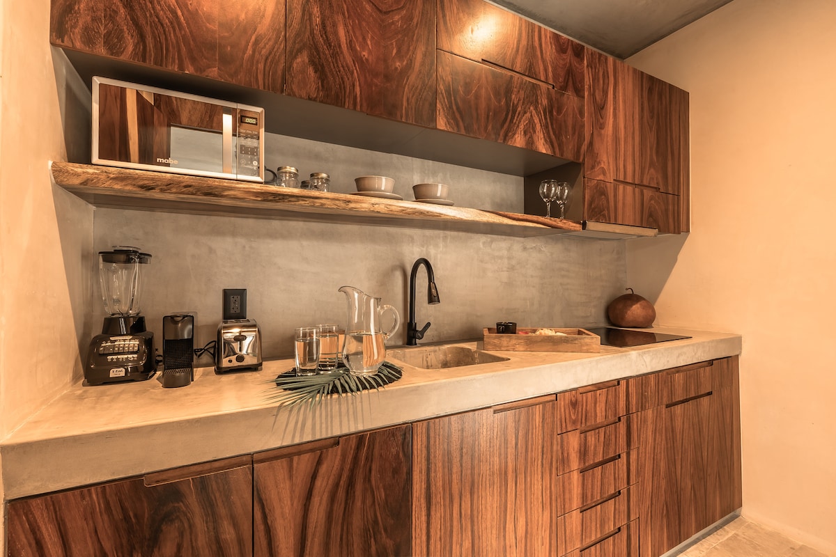 Căn hộ 1 phòng ngủ quyến rũ và riêng tư ở Tulum ♡ • Nhà hàng được xếp hạng hàng đầu tại chỗ Aroma Cafe Tulum • Hồ bơi kiểu Cenote với vòi mát-xa • Tự nhận phòng sau 3 giờ chiều • Trả phòng: 11:00 giờsáng • Internet cáp quang 1.000 Mbps • Điều hòa nhiệt độ đầy đủ. • 1 giường cỡ king + 2 giường đơn "sofa bed" • TV thông minh 42" 4K với vệ tinh và Netflix • Phòng tắm khép kín riêng • Nhà bếp đầy đủ tiện nghi + khu vực ăn uống • Chỗ đỗ xe riêng miễn phí • Bếp nướng ngoài trời • Dành riêng cho 2 người lớn và 2 trẻ em