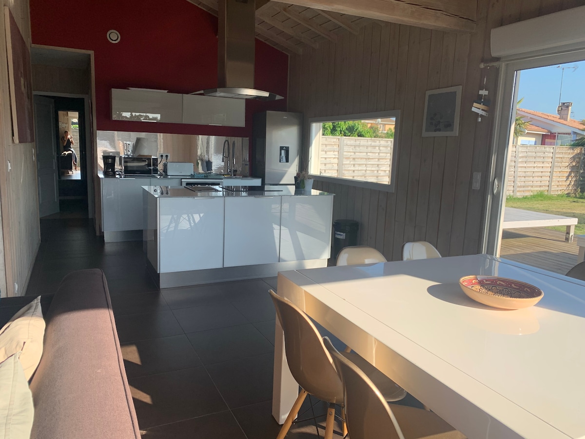 C est une maison en bois de 90m2 plein sud sur un terrain de 600m2 ... au calme sans vis à vis avec 2 belles chambres ... une chambre avec lit queen size et l autre avec un lit superposé … une salle de bain avec douche italienne et une baignoire ; elle se situe près des ports et des commerces , à 8km d Arcachon et 20 min de l'océan. Maison tout confort avec plancha , lave vaisselle et lave linge . Draps et serviettes fournis Place de parking gratuite et sécurisée Trampoline en place