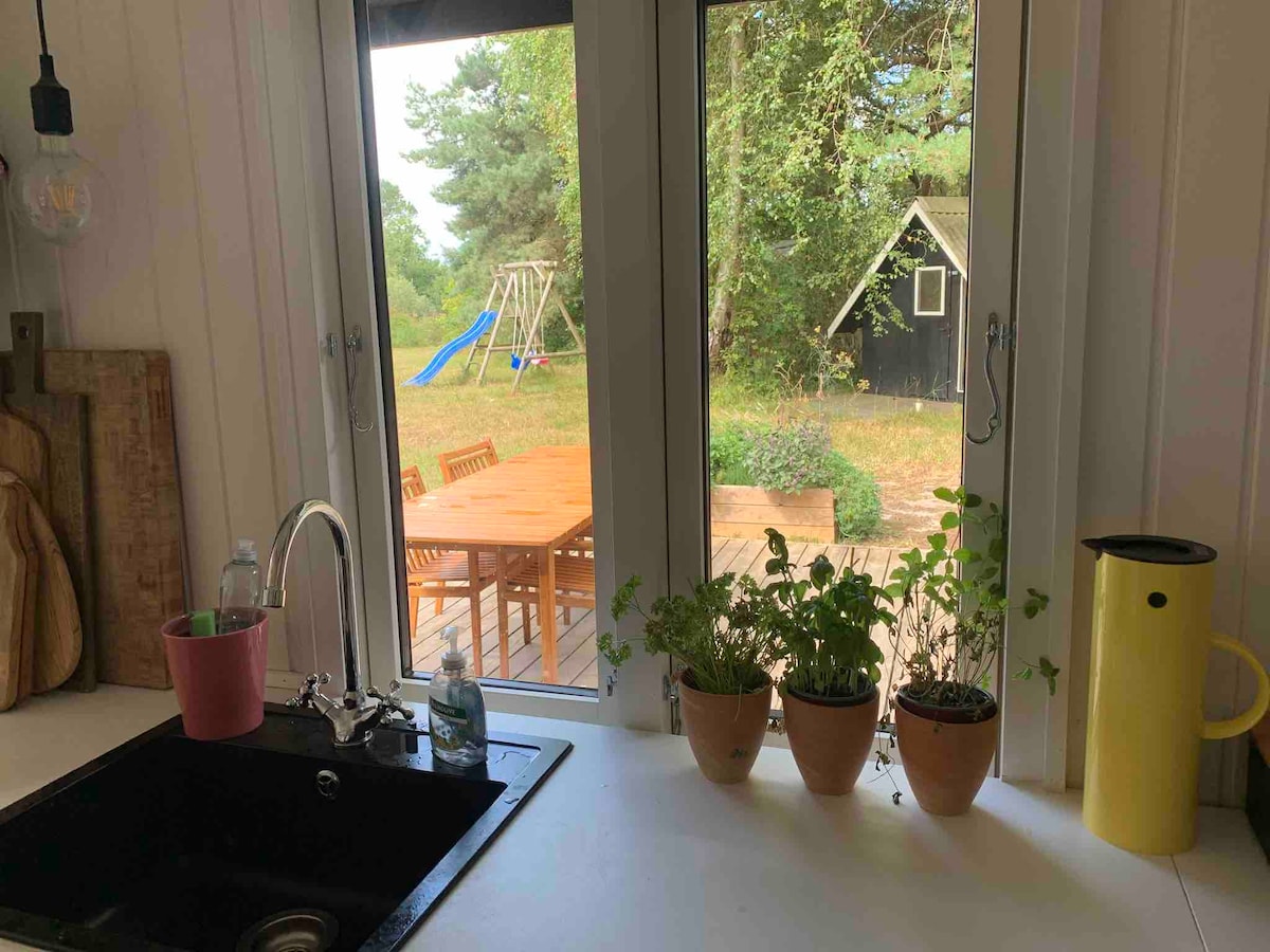 Flot svensk træhus, på en stor grund. Der er fint udekøkken med grill og vask. Der er solopvarmet udebruser. Til huset er der cykler. 1 tandem, 2 MTB 1 herrecykler og 2 damecykel + cykeltrailer. Trækvogn til små børn. Der er soveværelse med dobbeltseng, et værelse med 3/4 seng, og et værelse med køjeseng, hvor den ene seng er lille dobbeltseng . Der er også en stor hems. Shelter i haven til sove ude. Der betales 3 kr pr KW i el. Gæster sørger selv for rengøring, inden huset forlades.
