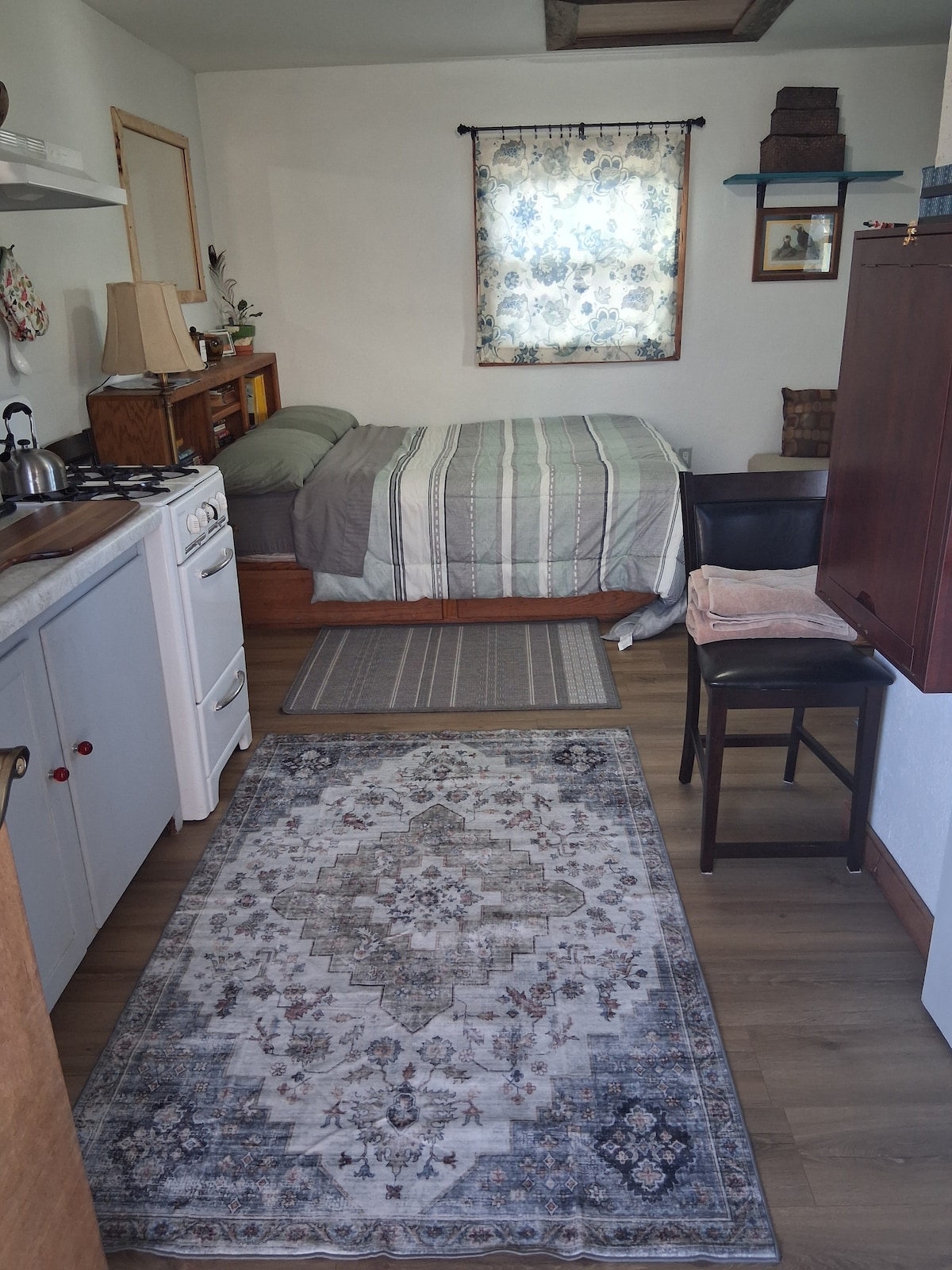 Perfect stop for Hwy 101 travelers! Older, semi-rural, residential neighborhood less than 3 miles from d’town Ukiah & freeway. Studio apartment (700 sq ft) of a multi unit residence. Cozy casita style; private entrance, designated private parking(2), private deck area Bedroom (queen size bed), living room, kitchen table Kitchenette (no oven or stovetop) suitable for reheating, light meal prep and delivery. Mini fridge, coffee, tea, snacks Guests control heat & a/c Cannabis friendly neighborhood