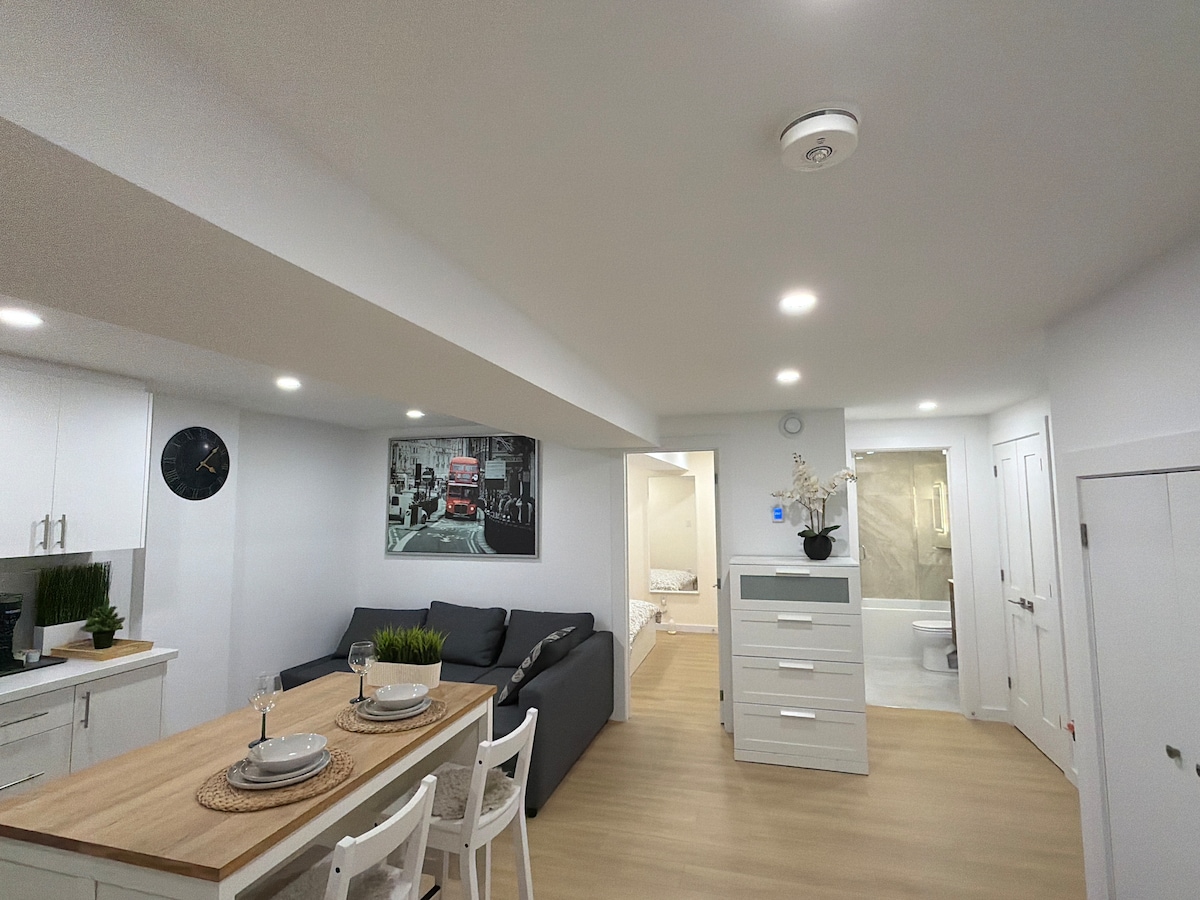 Căn hộ tầng hầm 1 phòng ngủ ấm cúng với giường sofa bổ sung, đón tiếp tối đa 4 khách. Sáng sủa và chào đón với nhiều ánh sáng tự nhiên từ cửa sổ. Nằm trong một khu dân cư yên tĩnh chỉ cách sân bay 10 phút, cách Trung tâm thương mại Cloverdale 5 phút đi bộ và cách Ga Kipling 2 km. Dễ dàng đến Hwy 427, bên cạnh các điểm dừng xe buýt, cửa hàng, công viên và nhà hàng. Có bếp nhỏ đầy đủ tiện nghi, TV thông minh, Wi-Fi tốc độ cao, chỗ đỗ xe miễn phí và ga trải giường mới — hoàn hảo cho các chuyến công tác hoặc kỳ nghỉ trong thành phố.