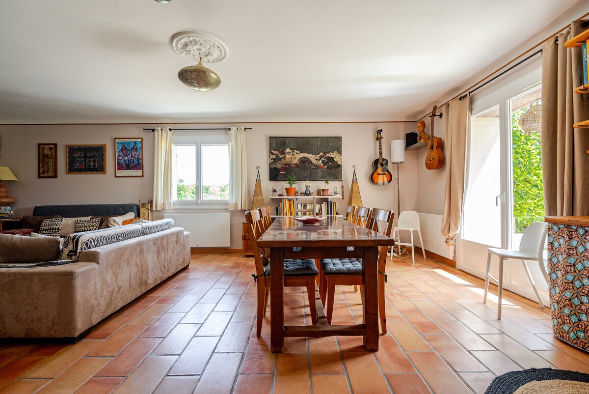 Khởi hành khi đến trong thời gian w-e có thể. Nhà một tầng 135m2 có hồ bơi, đất 1000m2 ở giữa vùng nông thôn, làng 10 phút đi bộ. 1 studio (giường 140/nhà bếp/vòi sen/wc). 2 phòng ngủ (1 giường 160, 1 giường 140). 1 phòng ngủ cho trẻ em ngủ 4 (giường tầng + giường sofa) + vòi sen và chậu rửa mặt. Phòng tắm chính: vòi sen kiểu Ý, wc, 2 chậu rửa mặt. 1 nhà vệ sinh trong hành lang. Phòng khách: sofa giường, 2 băng ghế Ma-rốc. Chỗ ở chính được trang bị đầy đủ tiện nghi và rất tiện nghi