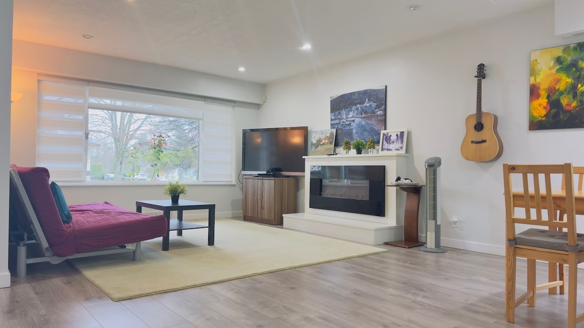 Enjoy a stylish experience at this centrally located place - minutes away from White Rock Beach and close to the USA Border. Brand new 2 bedroom "smart" suite (a few steps to get to the private suite). Fully voice controlled via Alexa. Tesla charger available if required.
