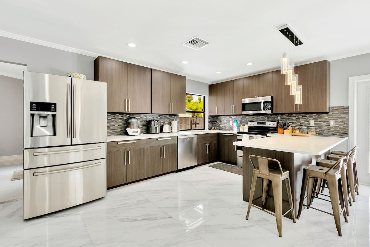 Tận hưởng chốn nghỉ dưỡng Flamingo Park riêng tư với hồ bơi nước mặn có hệ thống sưởi, sân vườn xanh tươi và nội thất hiện đại, sáng sủa. Ngôi nhà lịch sử đã được cải tạo này có bếp kiểu Ý đẹp mắt, khu vực sinh hoạt và ăn uống thoải mái, Wifi nhanh, TV thông minh và loa soundbar Sonos. Đi bộ đến các quán cà phê, nhà hàng và Bảo tàng Norton. Cách các bãi biển, sân golf và một công viên phù hợp với gia đình có sân tennis và sân pickleball mới vài phút. Tuyệt vời cho gia đình hoặc các chuyến công tác.