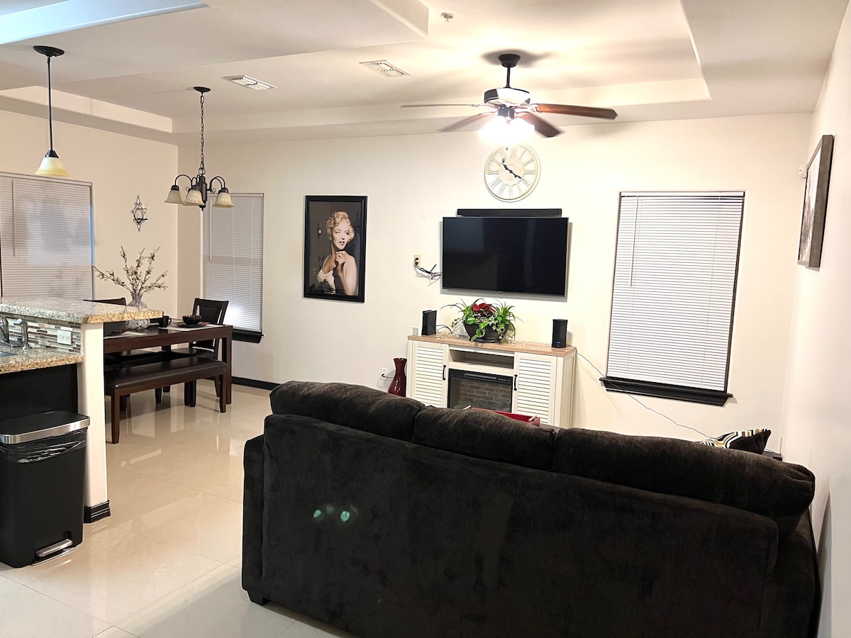 This home sleeps up to 8 guests if they share the double beds, or 6 guests if they want their own bed. It features 3 bedrooms, 2 full baths, 2 car garage, large driveway + extra parking with double gate. It sits in a corner lot, offers privacy and easy access to Loop 20 for quick travel around the city. 1. Laredo Airport, 🚘 5 minutes. 2. Lake Casa Blanca 🚘 5 minutes 3. Target,Walmart & restaurants 🚘 5 minutes. This property is great for families or work crews.