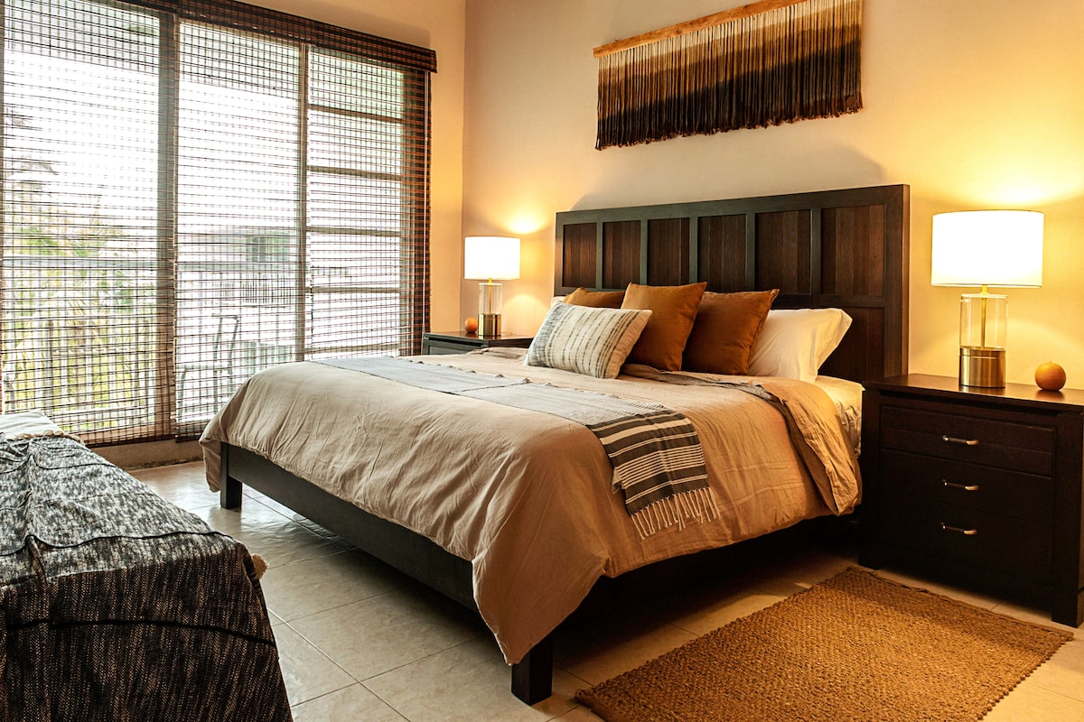 ¡Bienvenidos! Es un espacio pensado en tu confort, totalmente privado de uso completo para los huéspedes. Aire acondicionado en ambas recamaras. Dormitorio principal con 1 cama King size, en el segundo 1 litera con 2 camas matrimoniales y una individual. Los dormitorios tienen cortina black out para regular a tu gusto la iluminación. Estás a solo 650 m de la playa. Contamos con wiffi 300 megas, Smart TV Roku, plancha, toallas, estacionamiento al interior para un auto.