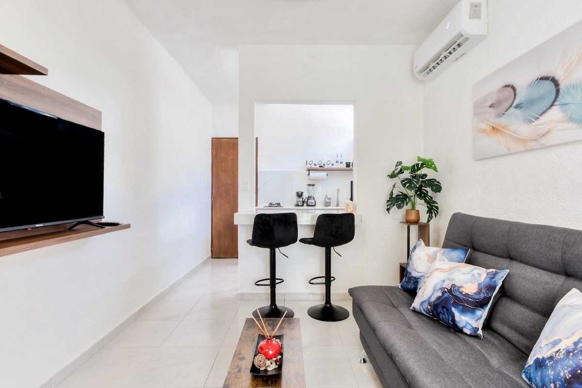 Studio 41. Một không gian ấm cúng được cải tạo hoàn toàn. Tọa lạc cách Sân bay Quốc tế Cancun 10 phút và cách trung tâm thành phố 10 phút. Căn hộ được bố trí 1 phòng ngủ với phòng tắm đầy đủ và không gian phòng khách có bếp. Bếp có máy rửa chén, minibar, bếp điện và tất cả các bát đĩa. Đây là một không gian yên tĩnh, thoải mái cho thời gian lưu trú ngắn và lý tưởng cho thời gian lưu trú dài hạn.