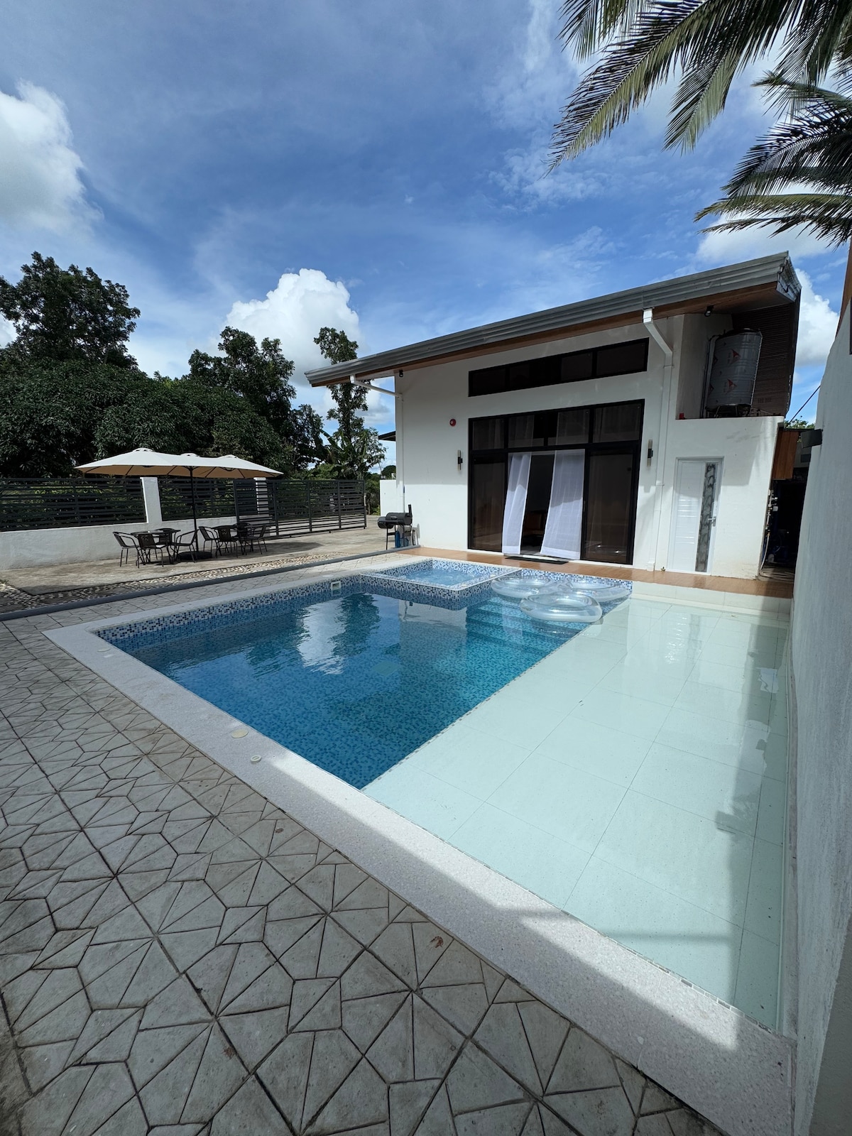 Exclusive just for your family and friends accommodate up to 12 persons 3-5 Ft depth above pool with jacuzzi (Jacuzzi Heater Additional 1,500 per use) Enjoy the Videoke 🎤 Play basketball 🏀 Cook with complete kitchen utensils Water Dispenser Light up a bonfire pit P200 fee for woods We clean, sanitize, and disinfect INCLUSIONS 3 ROOMS 2 Double beds each room good for 4pax with AC & Android TV (Netflix and YouTube) Toilet and Bath with shower heater Free Wifi 400 mbps speed Secured CCTV