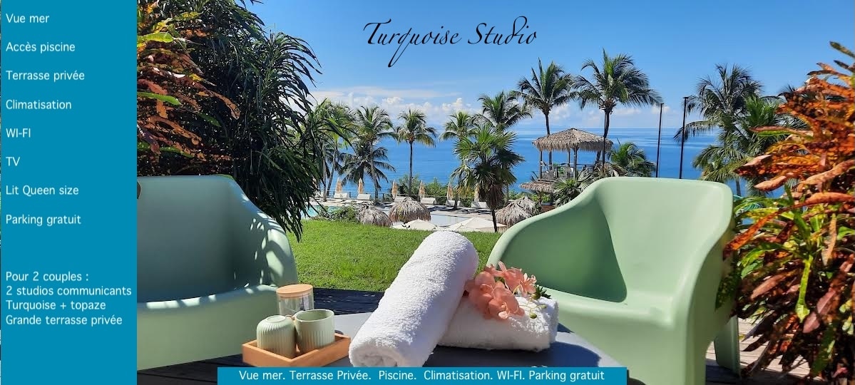 Venez admirer la vue imprenable depuis ce studio lumineux et élégant. Turquoise est situé dans une résidence avec parking sécurisé par un portail électrique. L'appartement est aménagé avec soin et bénéficie d'une terrasse couverte, prolongée d'un deck sur lequel vous ne pourrez qu'admirez sa vue imprenable sur le rocher du Diamant et la mer des Caraïbes. Vous pourrez accéder à la magnifique piscine. Idéal pour 2 personnes