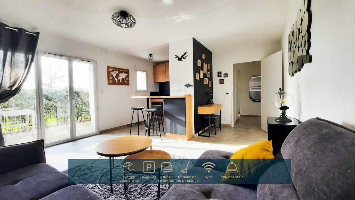 Hướng ra biển: tận hưởng một bức tranh toàn cảnh đặc biệt. Căn hộ tuyệt vời T2 (2/4 người) được cải tạo vào năm 2024 - THOẢI MÁI TUYỆT VỜI. Bãi biển và cồn cát nằm dưới chân căn hộ (không có đường để băng qua). Tầm nhìn đáng chú ý ra đại dương và đảo Yeu từ khu vực ăn uống, lôgia và thậm chí từ giường trong phòng của bạn. Chiêm ngưỡng hoàng hôn cho người yêu, gia đình hoặc với bạn bè. Bạn có gara có cổng của riêng mình; lý tưởng cho xe hơi của bạn và để lưu trữ xe đạp, xe rơ-moóc và các trò chơi trên bãi biển.
