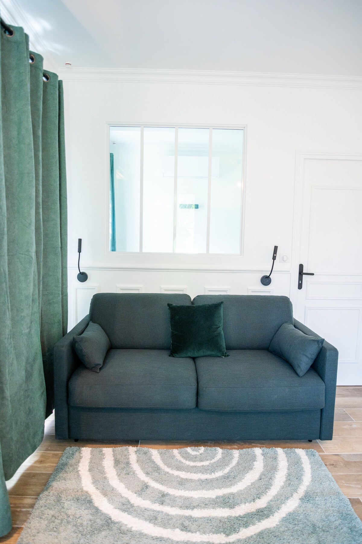 Căn hộ được chia thành 2 chỗ ở, mỗi phòng đóng cửa bằng chìa khóa của họ Lối vào căn hộ là chung cho cả hai chỗ ở. Chỗ ở của khách có tầm nhìn ra Tháp Eiffel không dùng chung, nó giống như một studio có ban công. Có khu vực phòng ngủ với giường cỡ Queen, 1 tủ quần áo, đèn sàn, bếp đầy đủ tiện nghi và khu vực tắm vòi sen nhỏ. Nhà vệ sinh nằm đối diện với phòng ngủ. Trên ban công: 1 bàn và 2 ghế, một không gian dành riêng để làm vườn.