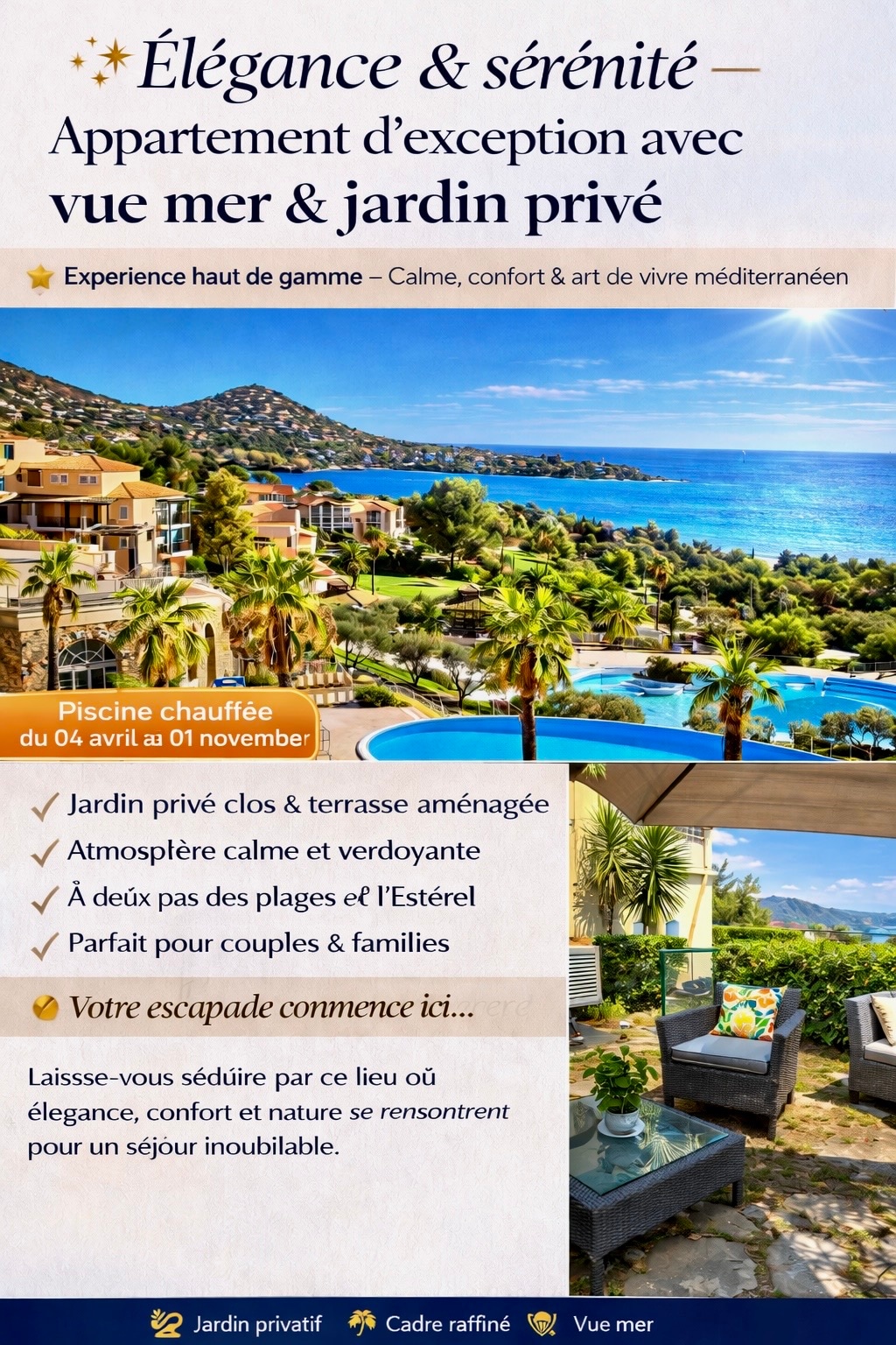 🌿 LE JARDIN DE L’ESTÉREL –VUE MER - ÉVASION & TOUT CONFORT POUR 4 PERSONNES Logement Classé PREMIUM ⭐️⭐️⭐️ ⭐️ Rénové et Climatisé 💎 : 📌 Les plages sont accessibles à pied à 10 minutes en bas du village vacances L’endroit le plus préservé de la Côte D’Azur. INCLUS = 💦—> 4 PISCINES dont une chauffée + —> Animations en journées et Soirées ( d’avril à début Novembre ) 🚗 Parking 🅿️ Couvert