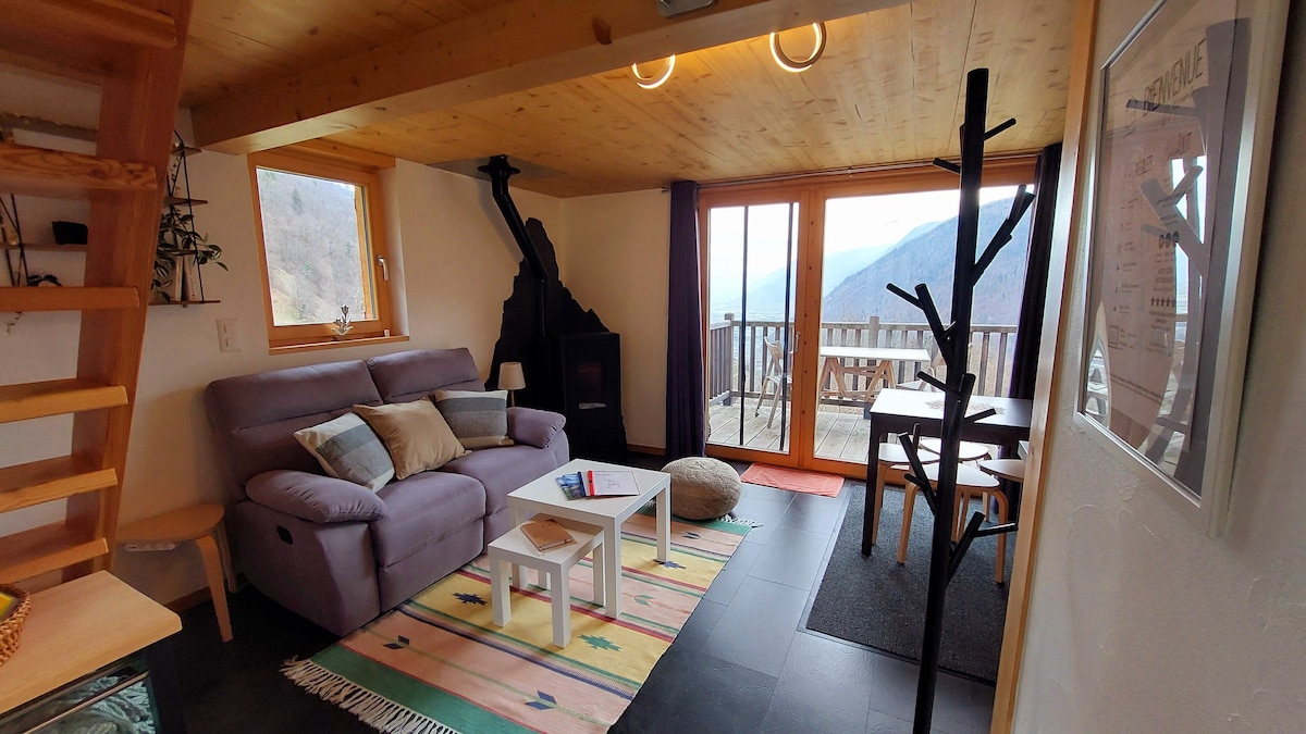 Nằm phía trên khu rừng và dòng sông, ngôi nhà nghỉ thôn dã sáng sủa và ấm cúng của chúng tôi nằm trong khu vực yên tĩnh và cách thiên nhiên, dòng sông một đoạn đi bộ ngắn, bắt đầu từ đường mòn đi bộ đường dài và cách xe buýt đưa đón 3 phút (hoạt động vào mùa đông) Căn gác lý tưởng để thư giãn và thả mình bên lò sưởi hoặc trong bồn tắm nước nóng. Hoàn hảo cho các cặp đôi. Hơn 2 người theo yêu cầu. Nó có 1 phòng ngủ (2 người) và 1 không gian mở dưới tầng lửng với TV và giường sofa thoải mái.