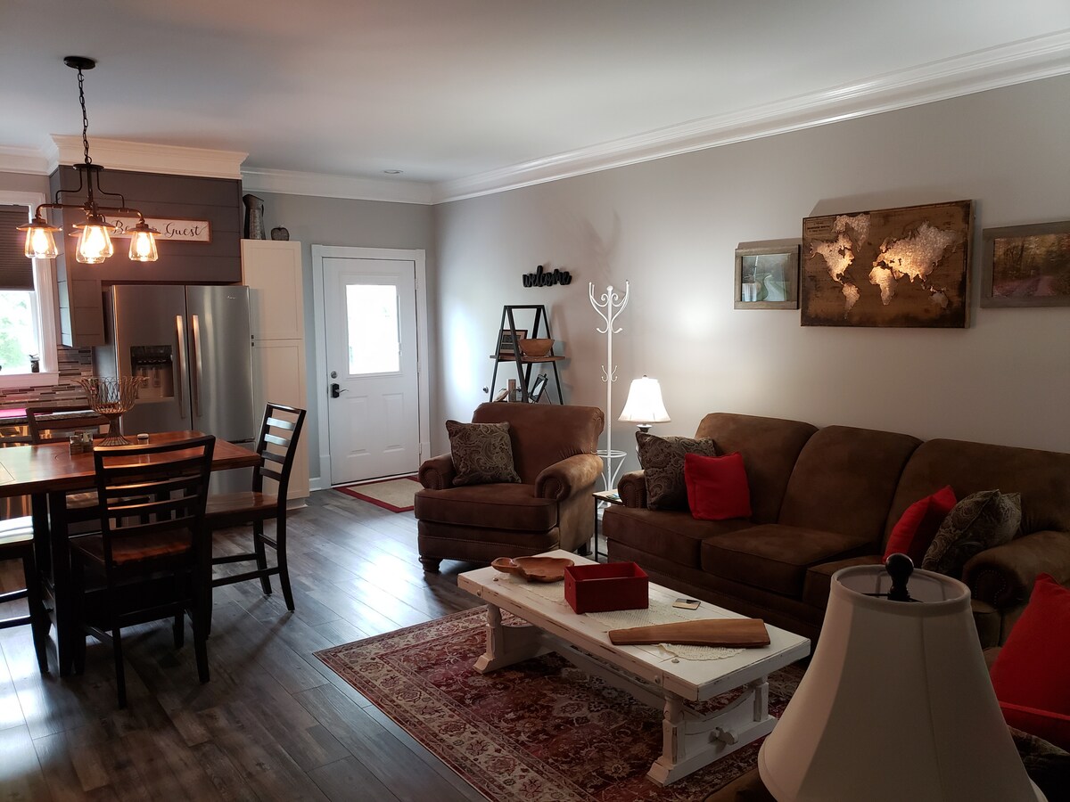 Riêng tư trong một khung cảnh đẹp. 3 phút từ Xa lộ Liên tiểu bang 40, 20 hoặc 25 phút từ trung tâm Nashville và 15 phút từ sân bay. TV 70 inch với hơn 85 kênh, cũng như TV trong phòng ngủ. Giường cỡ King với nệm Memory foam 12 inch. Chúng tôi cũng có 2 giường cuộn với nệm mút nhớ. Nhà bếp, thiết bị kích thước đầy đủ với máy rửa chén. Bát đĩa, nồi và chảo, đồ dùng ăn uống, máy pha cà phê thông thường và Keurig, máy xay sinh tố, lò nướng bánh mì. Sân hiên, thác nước & Koi Pond & Bồn tắm nước nóng