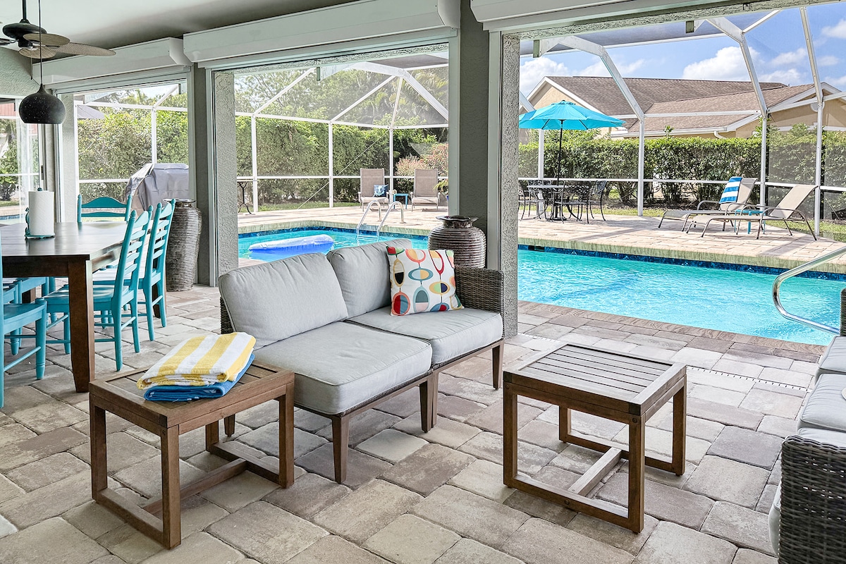 ✨ Welcome to The Periwinkle — a family-friendly pool home 10 min to Naples Beach! 🏊 XL heated pool, fire pit, screened lanai, fenced yard & BBQ 🍽️ Fully stocked kitchen, indoor/outdoor dining & WFH desk 🛏️ 4 bedrooms, 2 full baths, memory foam mattresses & smart TVs throughout 👶 Kids gear included — pack 'n play, high chair & more 📍 Naples Pier, 5th Ave, Sugden Park (beach, sailing, water-ski) & East Naples pickleball all within 10 min