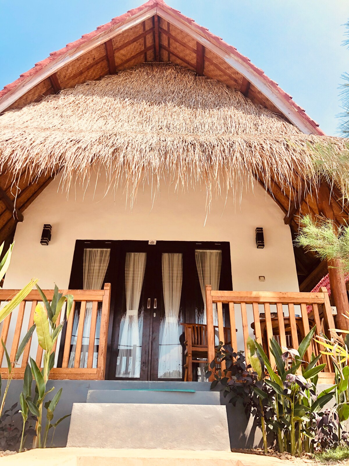 Những bungalow theo phong cách Bali tuyệt đẹp này hoàn toàn mới và đã được xây dựng để mang lại sự thoải mái tốt nhất có thể cho khách của chúng tôi. Nó được bao quanh bởi một cảnh quan tuyệt vời, nó nằm ngay giữa một đồn điền dừa, mang đến cho nơi này một nơi yên bình và yên tĩnh. Để đến đây, bạn sẽ đi bộ qua một con đường đi qua giữa cây dừa, chỉ cách đường chính 8 phút đi bộ và lối vào gần Sanctum lặn và quán bar.
