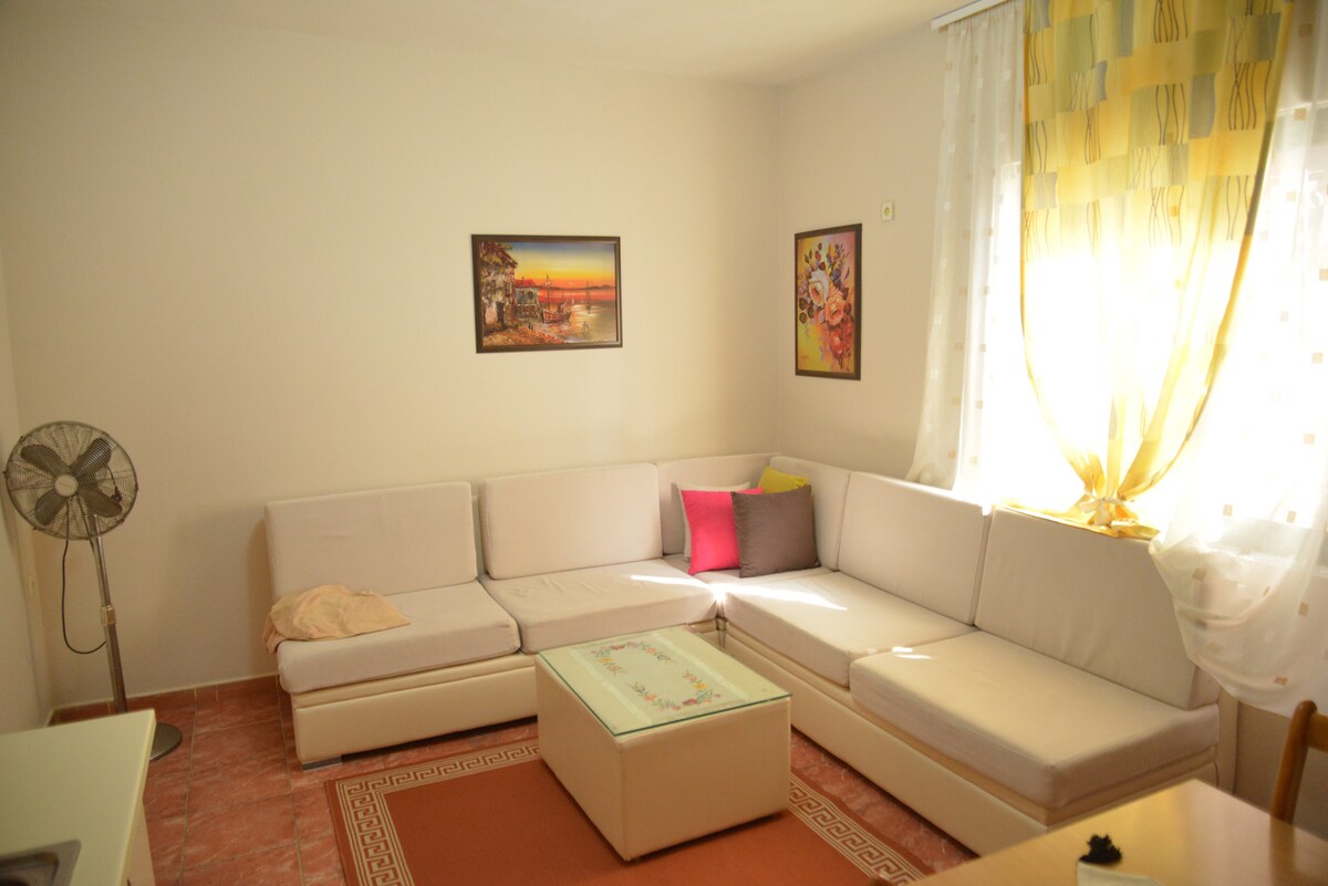 Amazing sunset views! Catch a falling star while sipping a drink on the balcony or have your morning coffee amidst the quiet, and fresh air of pine trees. Discounts for weekly and monthly stays. Very safe, gated community. Well equipped for remote work with fast Wi-fi and AC in each room. Self-catering! Fully equipped kitchen. Free parking. 45 min from Mother Teresa Airport and Tirana, 230 m to the beach, nearby café/restaurant, kids playground + market.