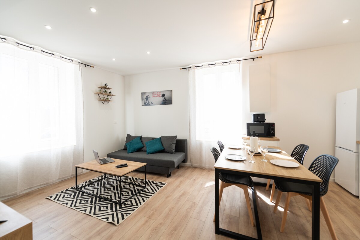 Căn hộ T3 ✨ ấm cúng với bể sục riêng. Hãy tự thưởng cho mình một khoảnh khắc thư giãn độc đáo trong bồn tắm nước nóng được lắp đặt trực tiếp trong phòng khách, trong bầu không khí ấm áp và thân mật. Lý tưởng cho một kỳ nghỉ cặp đôi hoặc một kỳ nghỉ với bạn bè, chỗ ở đầy đủ tiện nghi này cung cấp cho bạn tất cả tiện nghi bạn cần: bộ đồ giường thoải mái, nhà bếp, Wi-Fi tốc độ cao, ga trải giường được cung cấp... Tất cả những gì bạn cần làm là đặt hành lý xuống! 🅿️ Dễ dàng ra vào với bãi đỗ xe ngay phía trước. Trung tâm mua sắm 🏪 nhỏ ngay góc phố.