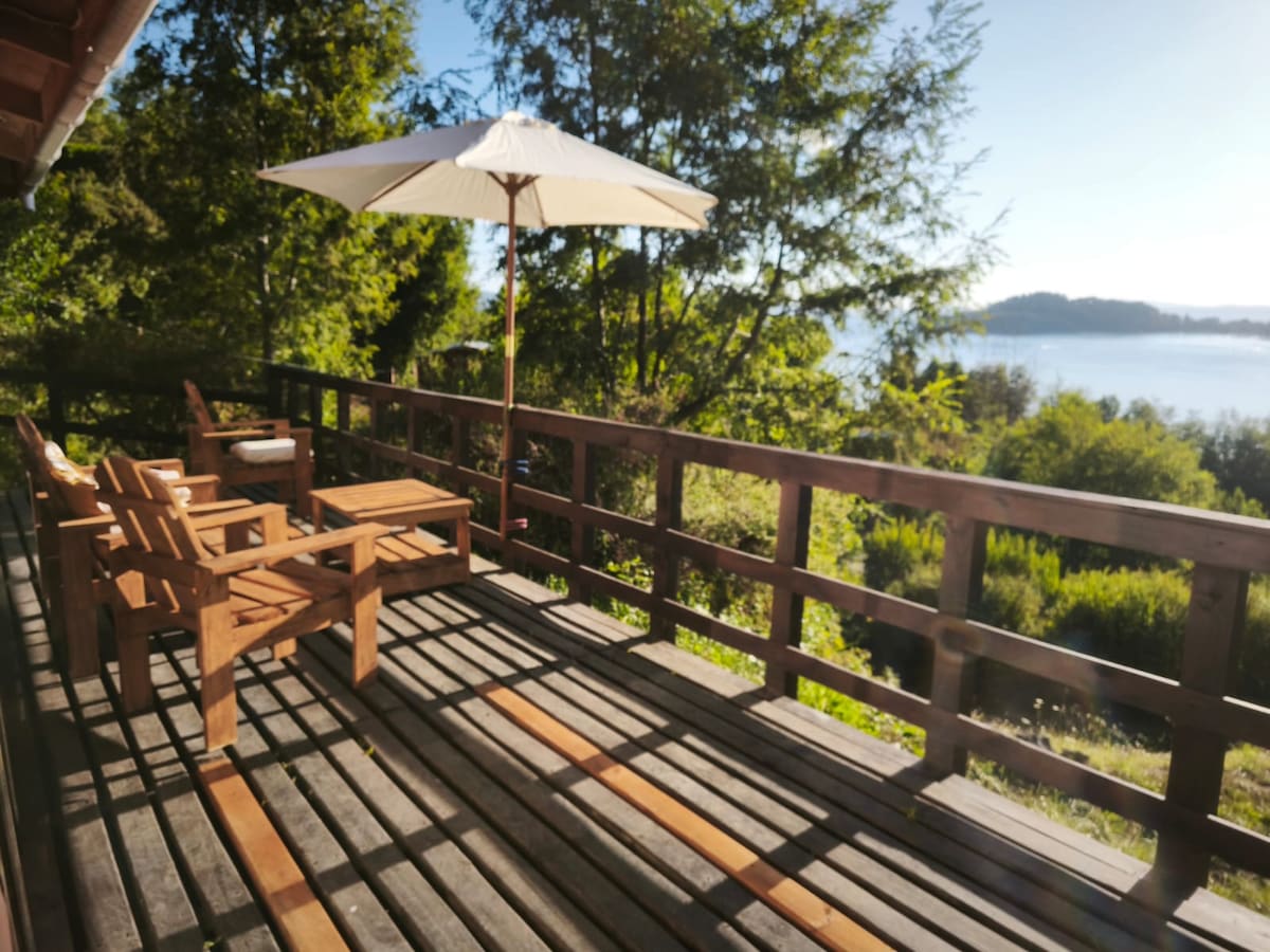 Beautiful Cabin in the Forest, located in the Lefún area between Villarrica and Pucón. It offers a stunning view of Villarrica Volcano, surrounded by native forest and birds. Every day you can hear Loicas and Chucaos. Fully equipped so you can enjoy your stay, disconnect, and relax. A lovely stream runs through the property. We recommend taking nighttime photos of Villarrica Volcano next to the wood stove with the panoramic view our cabin offers. We are sure you will love it!