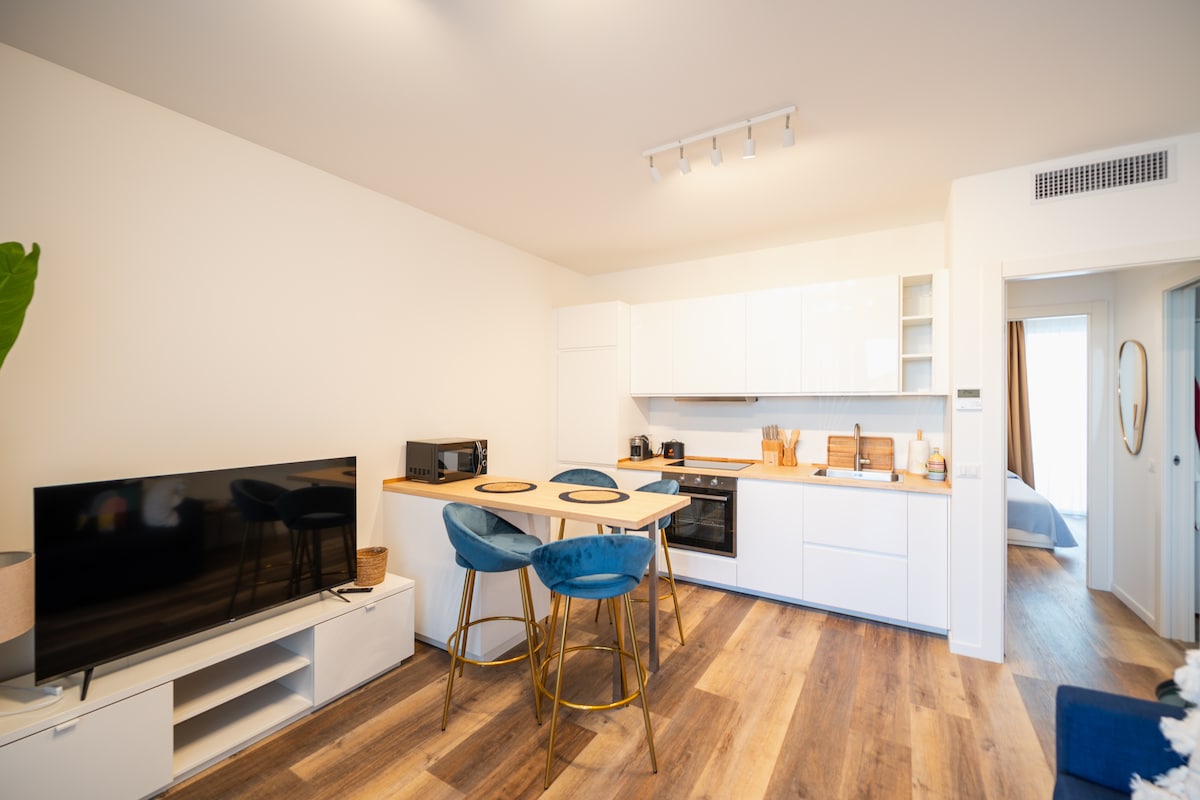 Studio ven sông ở khu vực rất trung tâm, lý tưởng cho các cặp đôi hoặc người độc thân. Nó có một điểm bãi biển với một chiếc ô và hai giường tắm nắng ở một vị trí tuyệt vời và bãi đậu xe riêng ở phía trước căn hộ được bao gồm mà không mất thêm chi phí (đối với khách du lịch, công viên sẽ có giá 18 euro/ngày và chiếc ô với giường tắm nắng năm nay sẽ có giá một tài sản, nếu bạn có thể tìm thấy chúng). 2 xe đạp gấp có sẵn trong căn hộ, bếp từ, TV 55 inch, Wifi, tủ lạnh Mỹ có nước lọc và đá