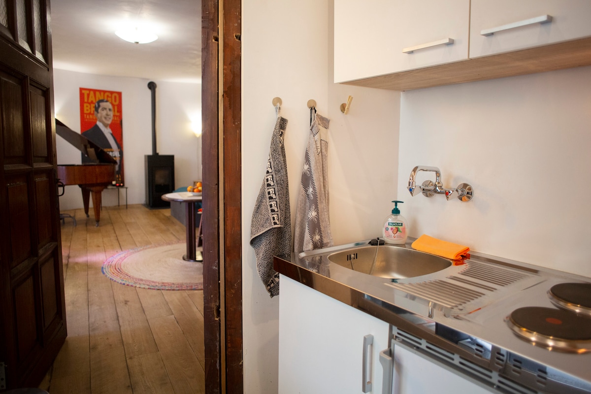 Studio nửa vòng 50 m2 với nhà bếp và phòng tắm trên Sint Pieter liền kề với Pietersberg và trên Meuse cách trung tâm 1000 mét. Xưởng khí quyển và không gian ngoài trời rộng lớn để sử dụng chung. Đỗ xe trước cửa (trả phí) hoặc miễn phí (cách 50 mét). Lối vào riêng, phòng tắm có bồn tắm và vòi sen và máy giặt. Bếp có tủ lạnh (chứa đầy đồ ăn sáng) và lò vi sóng. Hãy thưởng thức những chiếc bánh sandwich tươi ngon vào mỗi buổi sáng.
