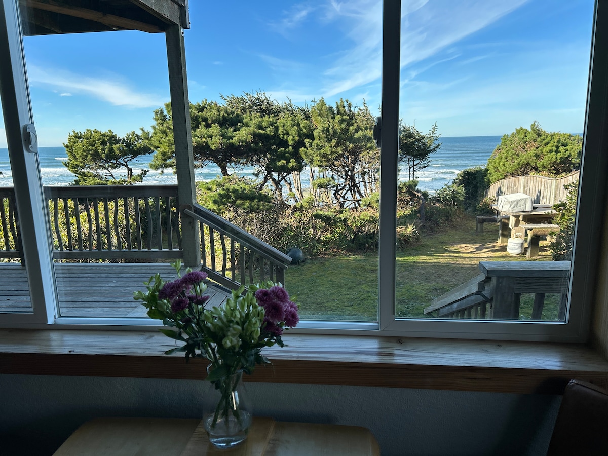 One level Oceanfront bungalow with spectacular views from the wall of double slider doors. Enjoy the ocean sights and sounds from this updated 2 bedroom, 1 bath home. Wood burning fireplace, washer and dryer and propane BBQ. Pets are welcome with a $50 fee and prior approval. We are a fully licensed rental and in compliance with local regulations. Nightly rate includes the 12% Lincoln County lodging tax. Airbnb collects the 2% state lodging tax