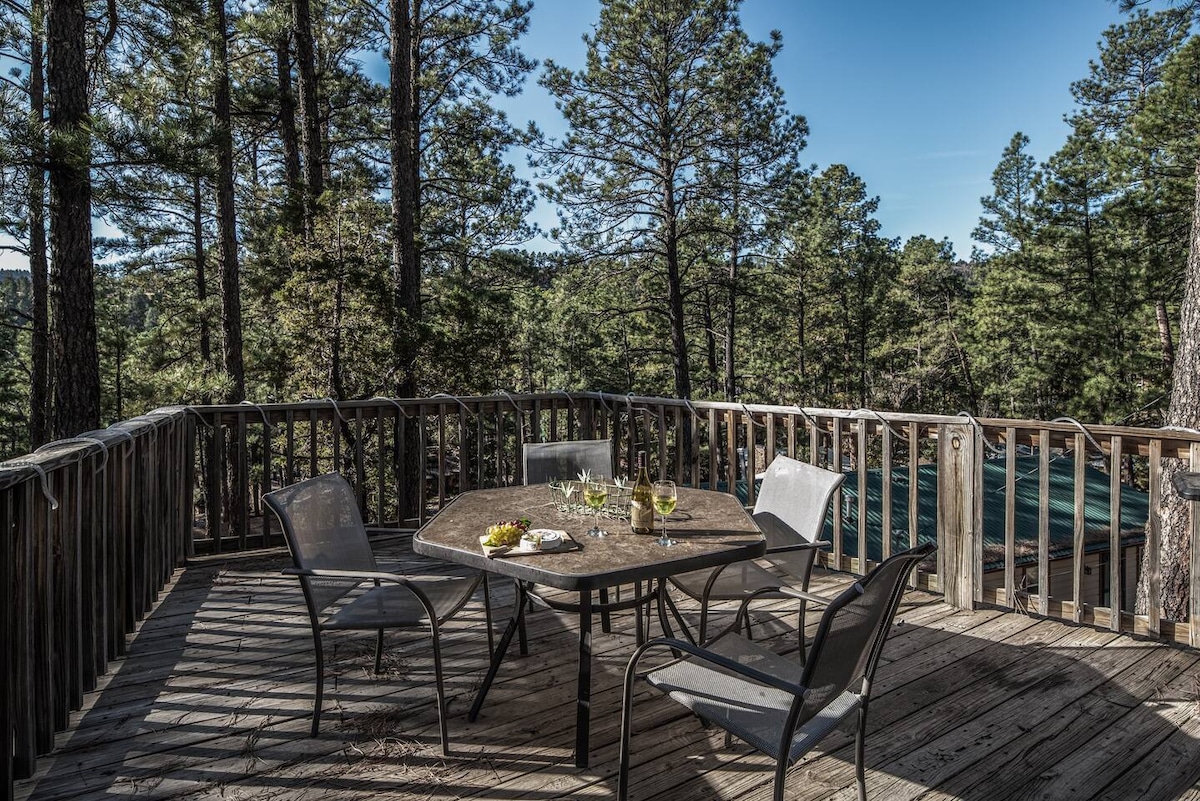 This cozy cabin is perched calmly among the tall pines and is perfect to accommodate up to 4 guests. Featuring one bedroom, one bathroom, living room, dining area, full kitchen, desk, new hot tub, and deck; it is ideal for those that want to unwind and enjoy what Ruidoso has to offer. It is situated in a quiet neighborhood that is a brief 10-minute stroll down the hill to Midtown, the village center for shopping and restaurants. The cabin is 37 min drive to Ski Apache, 10 min drive to casinos.