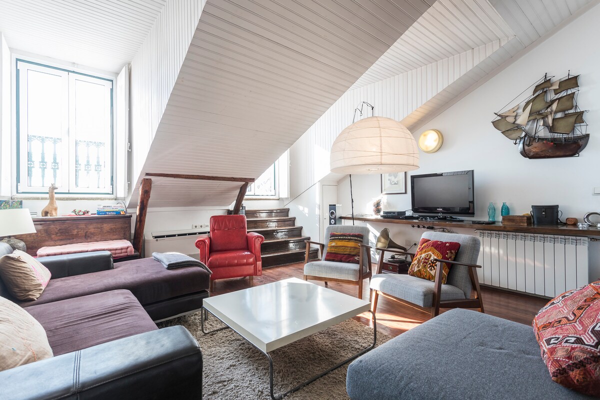 Với tầm nhìn tuyệt đẹp ra sông Tagus, không gian này nổi bật với trần nhà bằng gỗ cháy với tông màu vàng, mang đến bầu không khí độc đáo và tinh tế, và ban công với tầm nhìn thẳng ra sông. Căn gác hiện đại này có thể chứa tối đa 4 người trong diện tích 94 m². Nằm ở tầng 4 của một tòa nhà có thang máy, nó nằm ngay trung tâm khu phố Alfama điển hình. Bạn có thể đi bộ đến tất cả các điểm chính của thành phố, làm cho vị trí này trở thành một lối đi đặc quyền đến thành phố Lisbon.