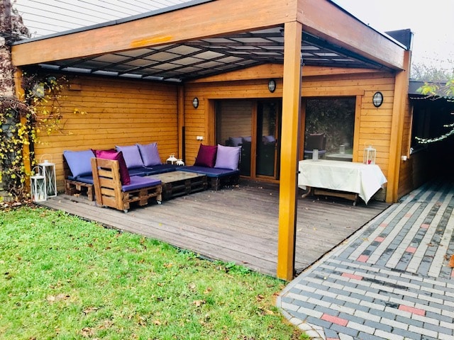This cozy 80sqm apartment includes a big private patio and 6-star hospitality! The place has a chilling-net above the living area and is divided over two floors. It accommodates groups up to 5 persons and is located in a quiet district just 10 min. walk from Vilnius' old town. The house is fully equipped to have an unforgettable stay in Vilnius. There is a parking available. Our apartment is featured by travel vlogger Eileen Aldis in YouTube video „First time in Vilnius, Lithuania“!