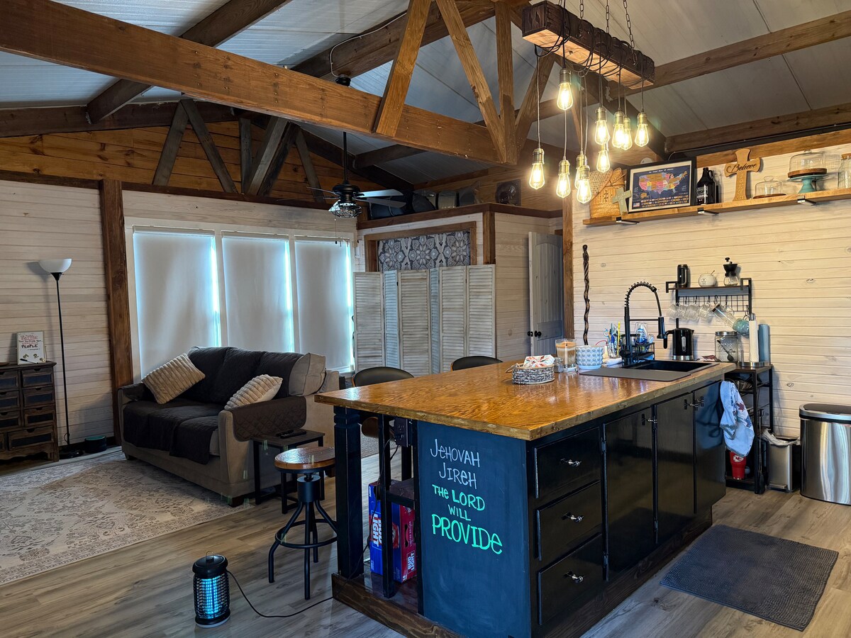 Romantic cabin; perfect, unique country escape. 1440sf open floor-plan w/king sized bed in the main area, WiFi, 75” smart tv, (no cable, use your tv apps), electric fireplaces, kitchen (no dishwasher), full sized w/d, dining area, walk-in closet, one bath w/shower & tub. Adjoining room separated by curtains & furnishings, not walls/doors. Includes a twin daybed w/pop-up trundle that makes it a king. Sits on 20 fenced acres w/secure gated entry, fire pit & fishing pond that won’t disappoint!