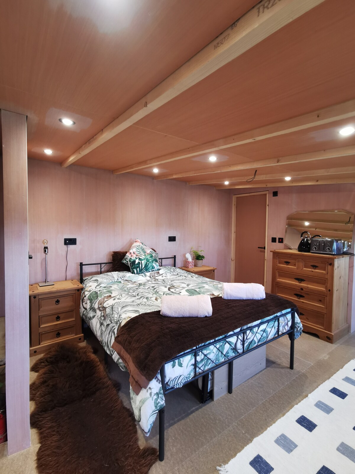 Welcome to our charming shepherd’s hut, nestled away in a private woodland. The hut is equipped with a comfortable double-bed with space for a child’s bed if required. Shower and Flush toilet are within an upcycled boat wheelhouse 30meters away. If travelling as part of a larger group, please see our other listings featuring B&B rooms available within the main house. We are located just outside the traditional market town of Mold.