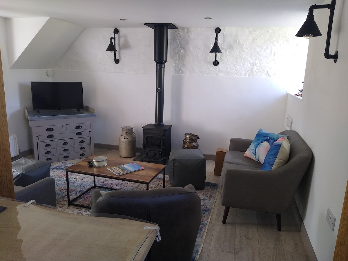 A quirky converted barn in stunning North Wales.Ideally placed for many activities. Beaches, mountains, quaint villages,sport and more. With Super-fast WiFi. Comfortable rustic charm with modern conveniences plus 5 outdoor spaces to enjoy after a full day of sightseeing or just stay put in front of the fire.Surrounded by lush green countryside with great views across the fields to the hills and sky.Bring your telescope,bring your paints. Ah. Doesn't that feel better 🙂.