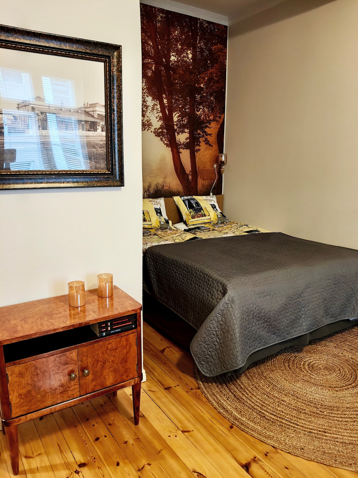 The comfortable and elegant flat is ideal for short visits as well as longer stays. It is located two blocks from the pedestrian street and the Hansa shopping centre. All shops and restaurants are within walking distance. The flat has a sofa, open kitchen and dining table for 4, and a double bed that can be separated into 2 singles. Decorated with contemporary art! Tyylillä sisustetussa asunnossa on sohva, parisänky (160 cm) tai 2 x 80 cm, täysin uudistettu avokeittiö ja ruokapöytä neljälle.