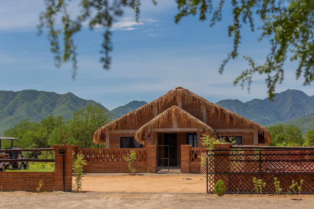 Ngôi nhà được xây bằng bùn với mái nhà Palapa, hơn một nghìn chai tái chế, rất thoải mái và có kiến trúc địa phương, không có sự sang trọng mộc mạc nhưng rất đẹp.