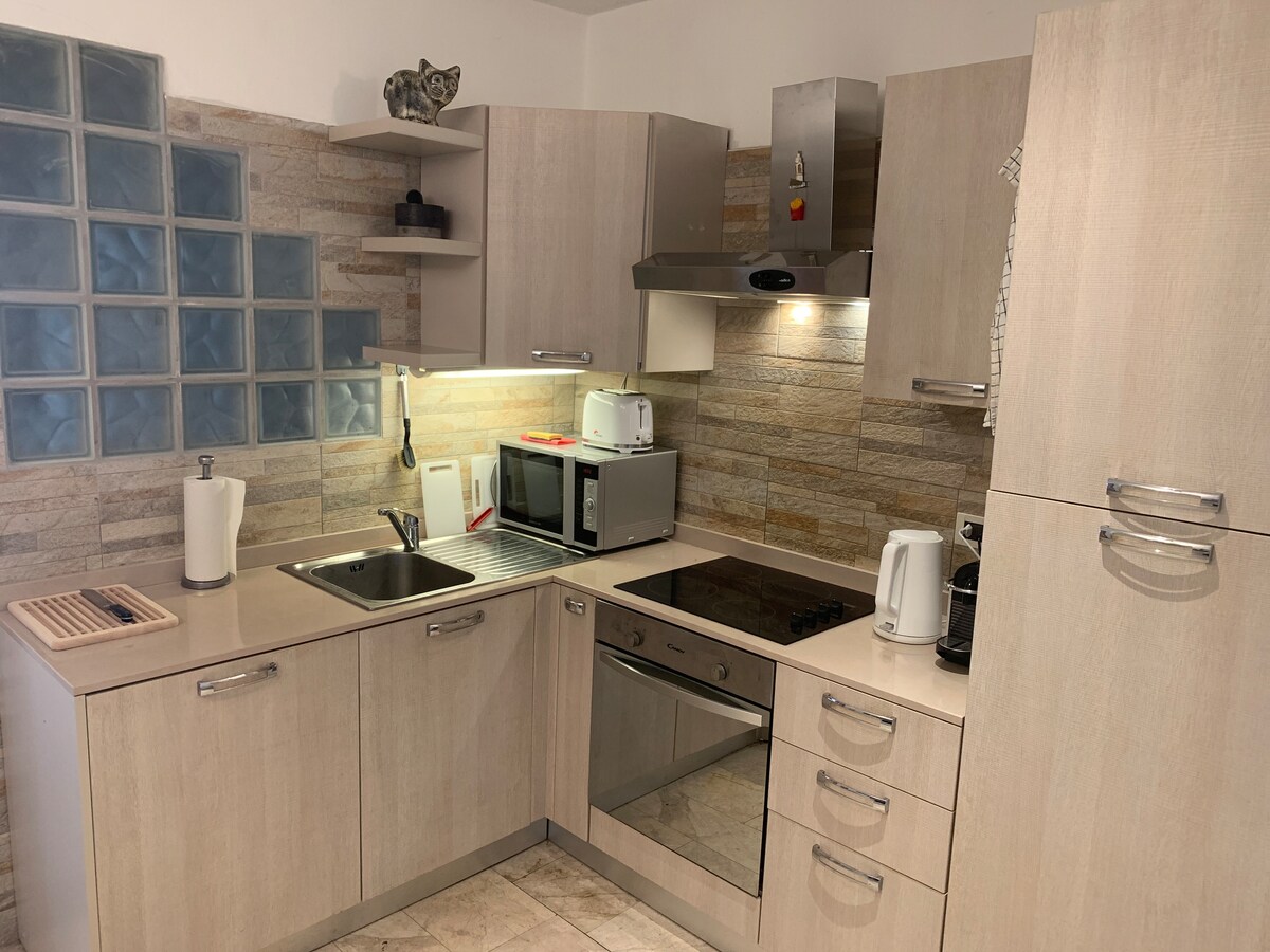 Our apartment is part of a well-maintained holiday residence on a lushly landscaped hillside property. It is suitable for 2 adults and 1 to a maximum of 2 children. The terrace is surrounded by greenery, nestled among palm trees and flowering shrubs. Here you can enjoy the magnificent 180° panoramic view in any weather. The Italian country-style furnishings have been complemented with some modern touches. Free sun loungers and parasols are available by the pool below.